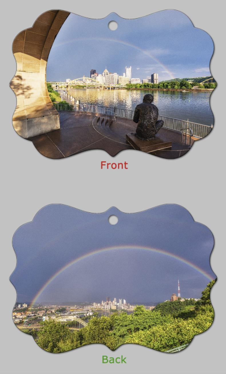Rainbows over the skyline and Mister Rogers statue in Pittsburgh.