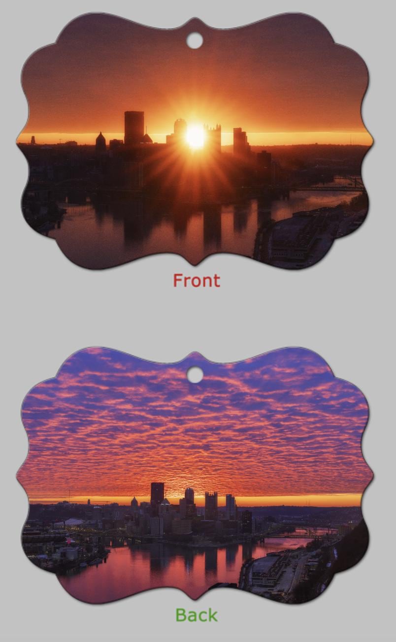 Metal Ornaments are made using the same state-of-the-art process as full-size metal prints. Dyes are infused onto specially coated aluminum, for a special memento with exceptional durability. Double-sided and delivered ready to hang, with a red ribbon attached.