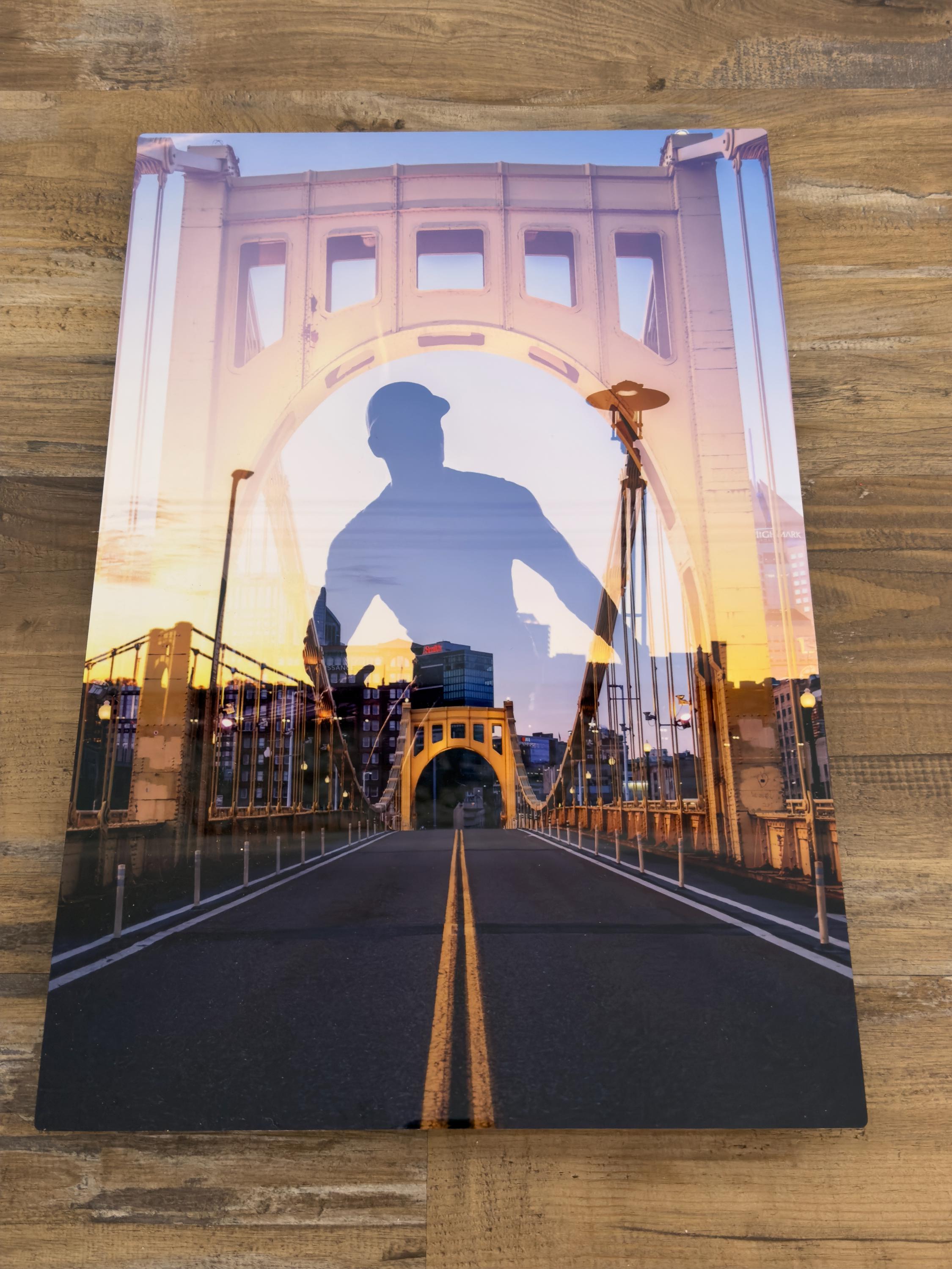 This is a 16x24 metal print of the Clemente Statue and Clemente Bridge.