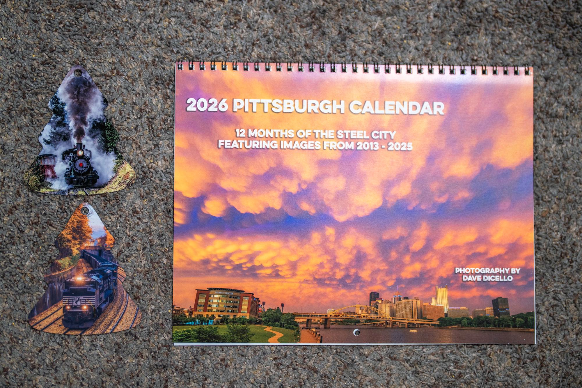 This bundle includes my 2026 Anniversary Calendar along with a metal, double side ornament of trains in Pittsburgh and Colorado.