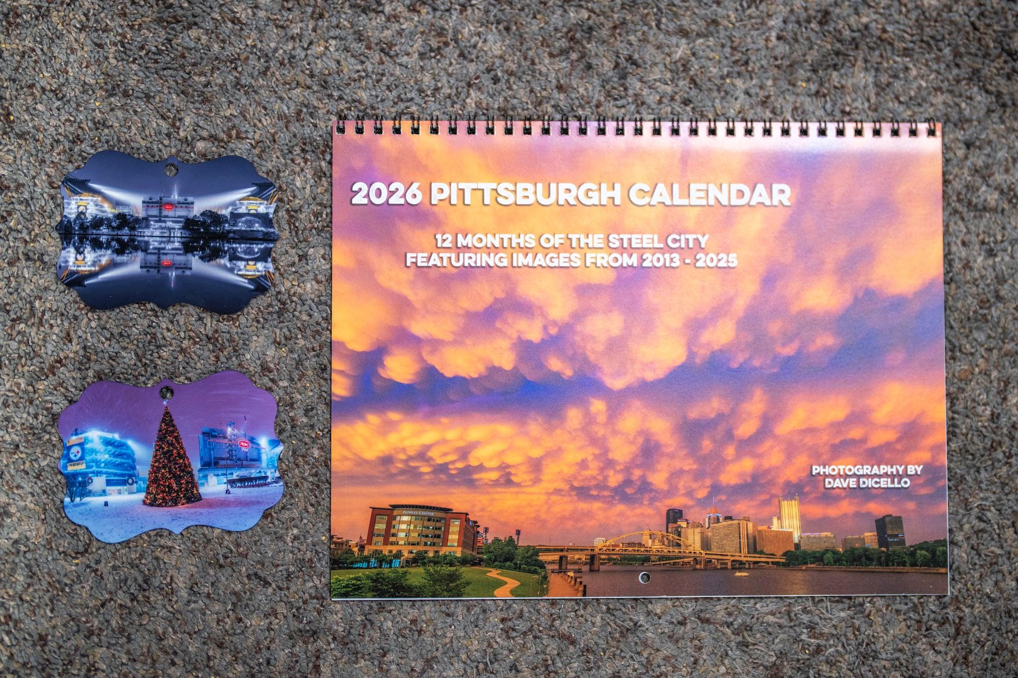 This bundle includes my 2026 Anniversary Calendar along with a metal, double side ornament of Heinz Field in the snow.
