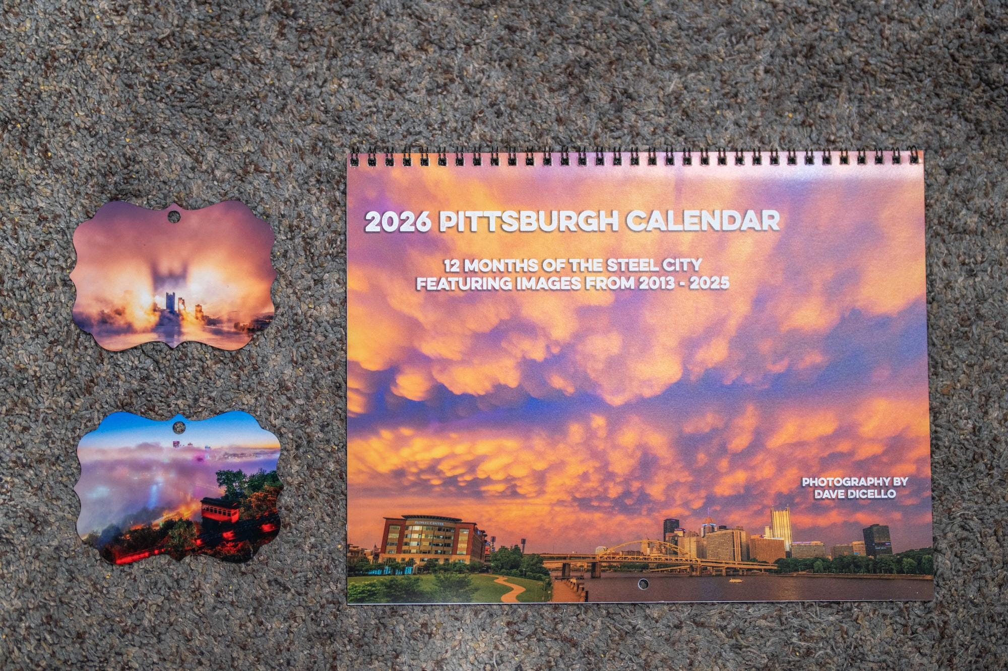 This bundle includes my 2026 Anniversary Calendar along with a metal, double side ornament of Pittsburgh in the fog, including the Batman sunrise.