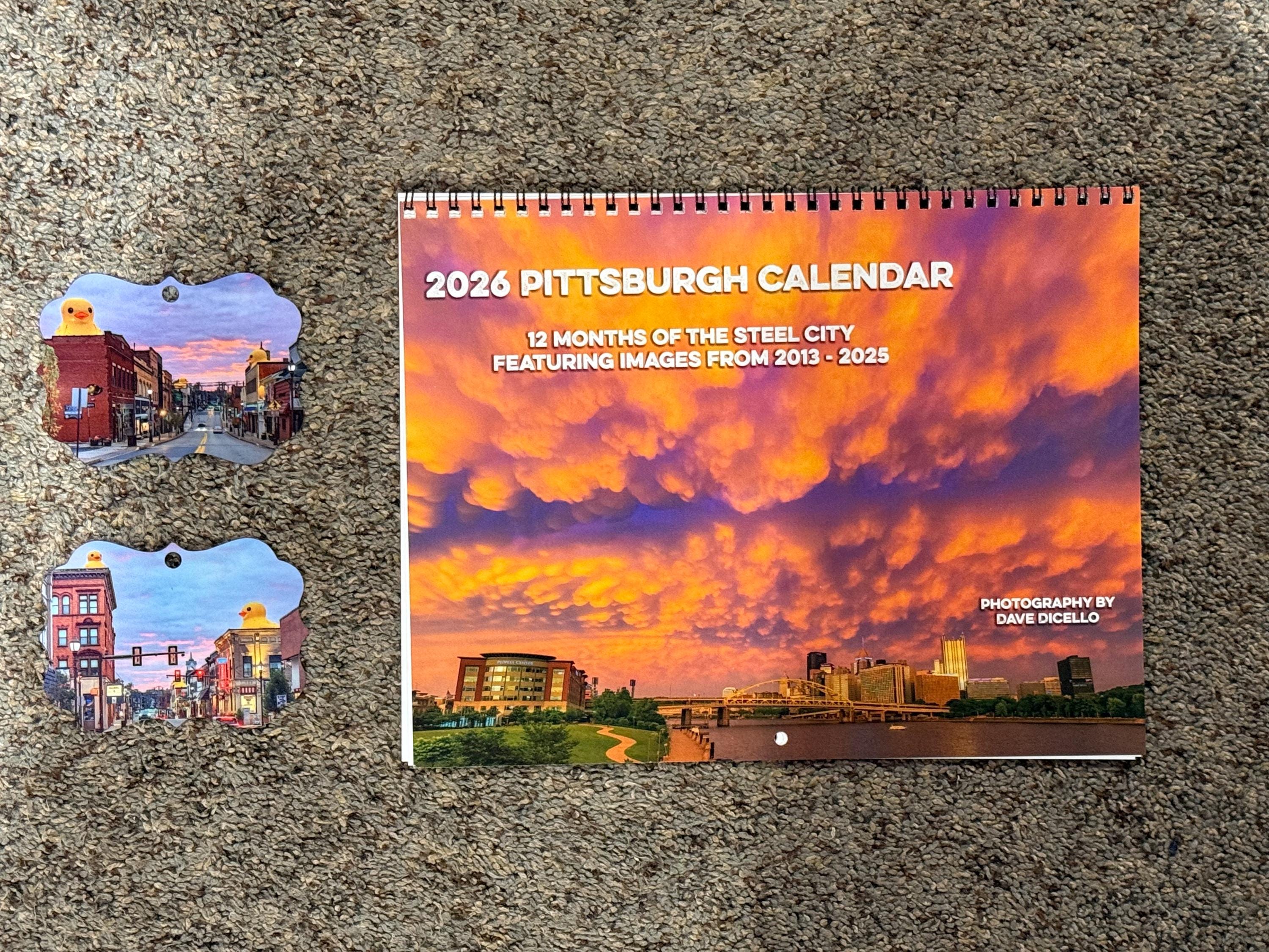 This bundle includes my 2026 Anniversary Calendar along with a metal, double side ornament of images of the Canonsburg Ducks.